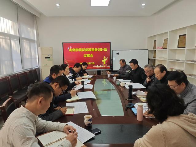 11月27日上午,击剑学院在击剑馆一楼会议室召开2024-2025年花剑项目冬训计划过堂会。校党委常委、副校长刘健出席会议并讲话,校训练与管理督导组专家任大新、姚勇到会指导。击剑学院全体管理干部,花剑组主教练、科医保障人员参加会议。会议由击剑学院院长沈朝阳主持。