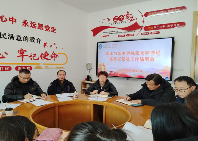 根据学校党委工作部署,12月17日中午,武术与艺术学院党总支在教学实验楼2号楼308会议室举行2024年度党支部书记抓基层党建工作述职会,党总支委员、各支部委员参加会议。会议由党总支书记叶瑛主持。
