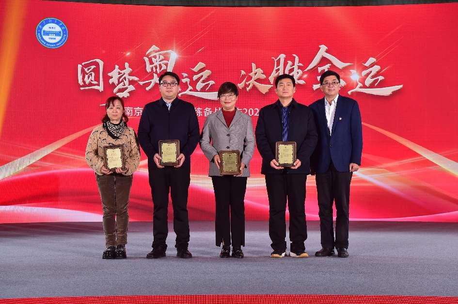 与会领导为王芳、李莉颁发“2024年奥运会突出贡献教练员”奖杯