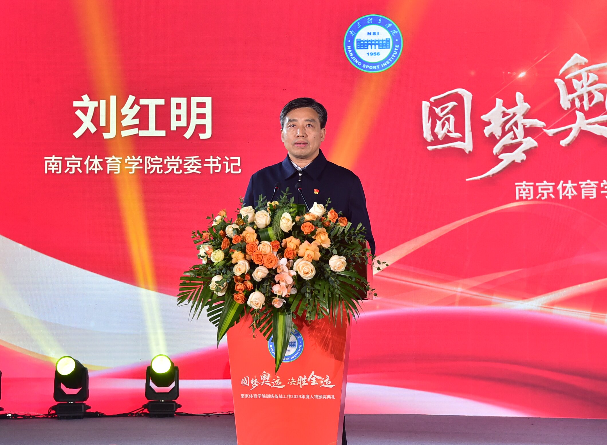 刘红明在致辞中代表学校对各位运动员、教练员取得的辉煌成绩表示热烈的祝贺,向长期默默奋战在训练竞赛一线的科医保障人员、管理服务人员致以诚挚的问候,向所有为学校竞技体育发展进步贡献力量的社会各界朋友们致以衷心的感谢。他指出,2024年是学校的“冠军丰收年”,11支运动队征战在国际国内各大赛场,圆满完成了各项备战参赛任务,实现多项赛事的历史性突破,学校先后有65人次夺得25个项次金牌,13人次夺得5个项次银牌,19人次夺得9个项次铜牌,新增奥运冠军2人、世界冠军11人,持续彰显了作为“世界冠军摇篮”的强大竞技体育实力。针对即将到来的2025年十五届全运会,他强调学校上下要锚定目标,持续发挥教学、训练、科研“三位一体”特色优势,团结协作,攻坚克难,不断创造江苏竞技体育新的辉煌,奋力扛起江苏体育强省建设“走在前、做示范”的使命担当,在推进中国式现代化江苏新实践中作出南体新的更大的贡献。