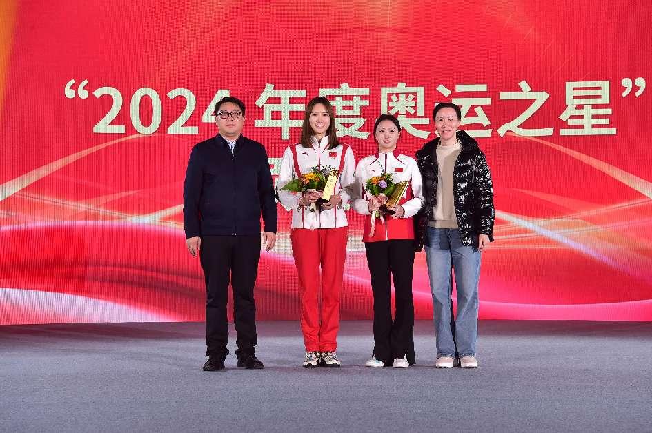 与会领导为王赐月、郝婷颁发“2024奥运之星”奖杯