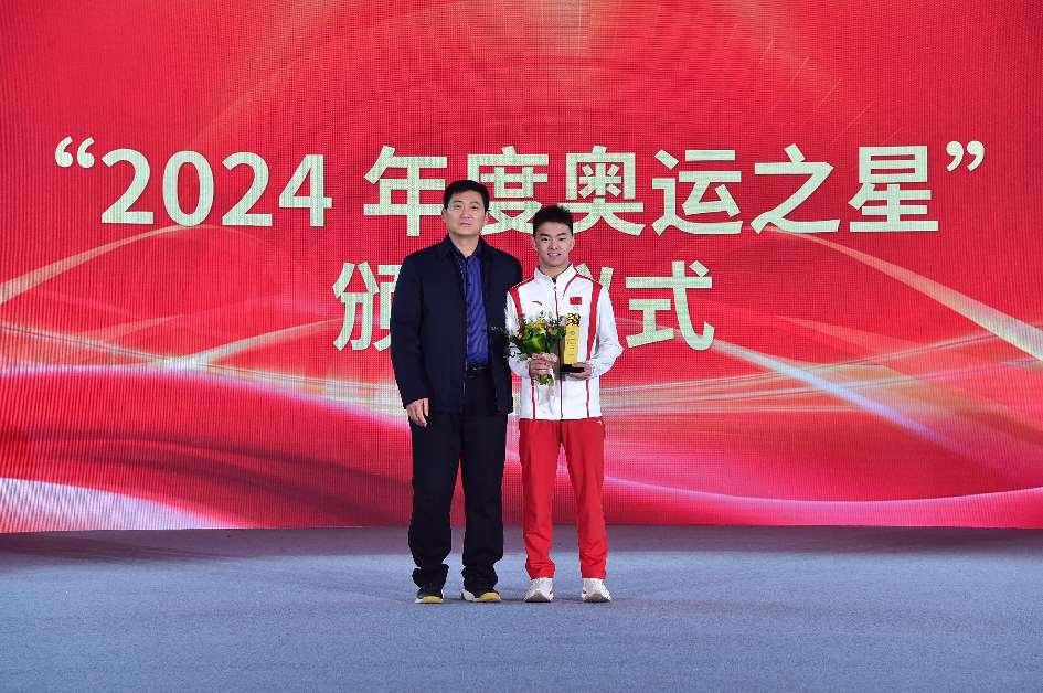 与会领导为王梓赛颁发“2024奥运之星”奖杯
