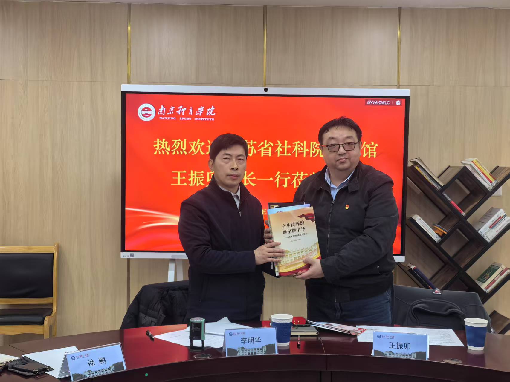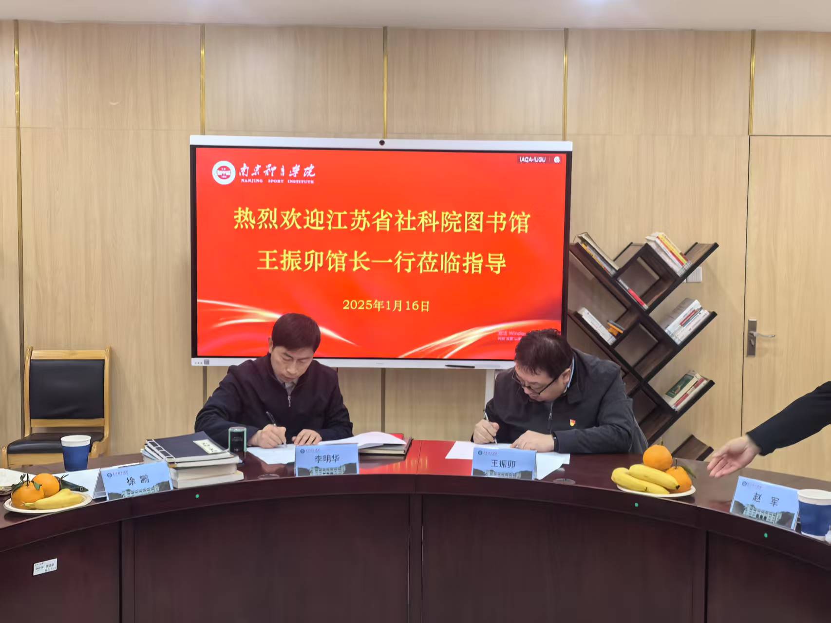随后,两馆签署了馆际合作共建协议,双方就资源共享、阅读推广、人才培养等方面达成合作意向。两馆还互赠了图书资料,我馆向对方捐赠《PA视讯集团入口校史1956—2021》《PA视讯集团入口奥运冠军录》《体育之研究》《近代著名人物体育题词》《PA视讯集团入口图书馆读者教育手册》等资料,同时接受社科院图书馆捐赠的《江苏蓝皮书—2025年江苏发展分析与展望《长三角蓝皮书——长三角高质量一体化研究报告(2023)》《智库文集:现代化新征程的智库使命与担当》等15册重要学术资料。