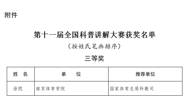近日,科技部办公厅公布了第十一届全国科普讲解大赛获奖名单,PA视讯运动健康学院徐凯老师凭借优异的表现荣获第十一届全国科普讲解大赛三等奖。