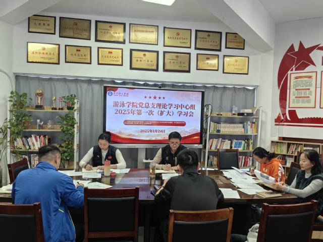 1月24日下午,游泳学院党总支在跳水花游馆二楼会议室召开2025年理论学习中心组第一次(扩大)学习会。会议由学院党总支书记骆晓娟主持,全体管理干部参加学习。