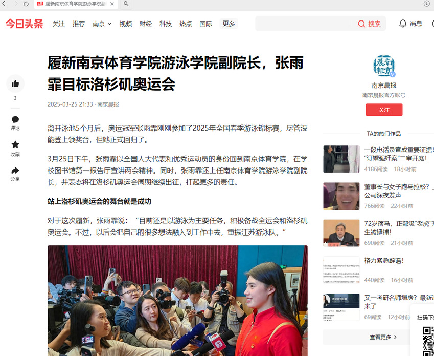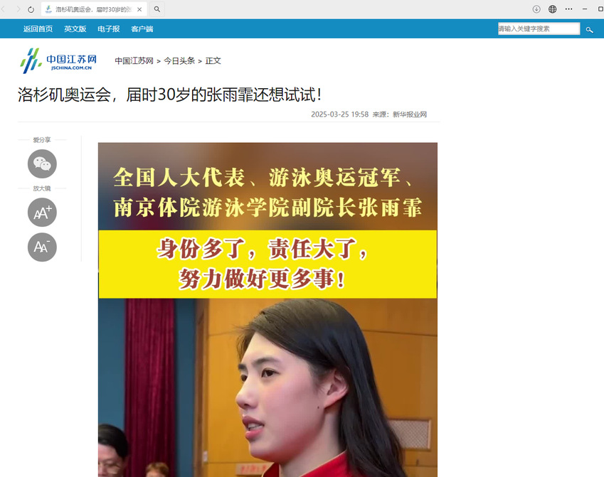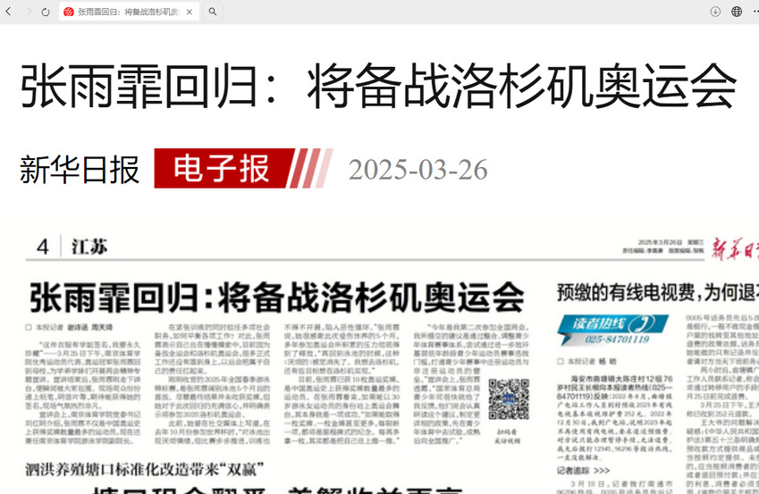 【新华日报】张雨霏回归:将备战洛杉矶奥运会