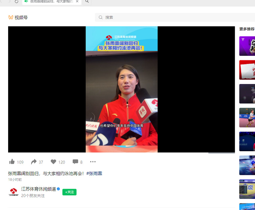 【江苏体育休闲频道】张雨霏阔别回归,与大家相约泳池再会!