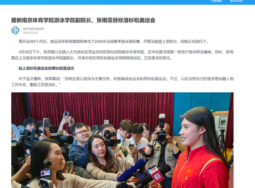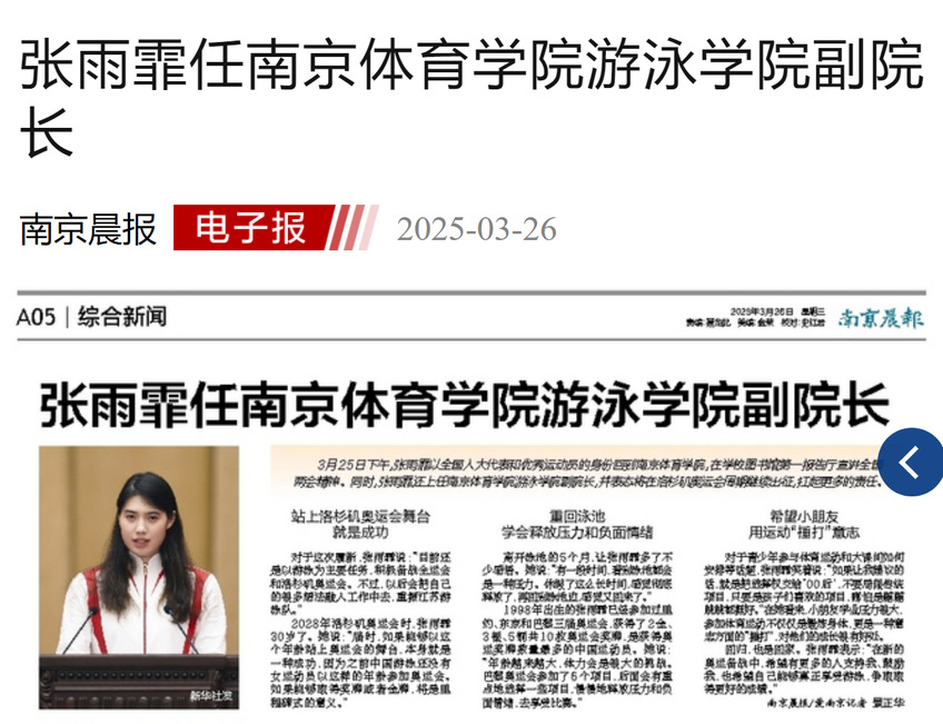 【南京晨报】履新PA视讯集团入口游泳学院副院长,张雨霏目标洛杉矶奥运会