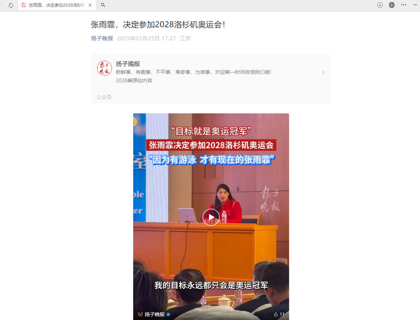 【扬子晚报】张雨霏,决定参加2028洛杉矶奥运会!
