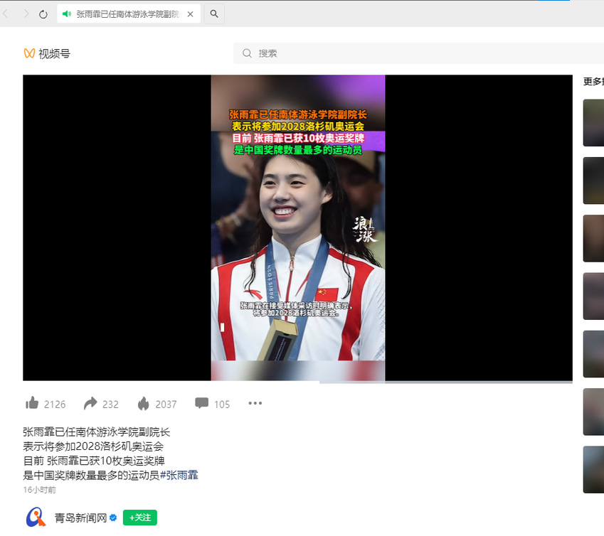 【青岛新闻网】张雨霏已任南体游泳学院副院长,表示将参加2028洛杉矶奥运会