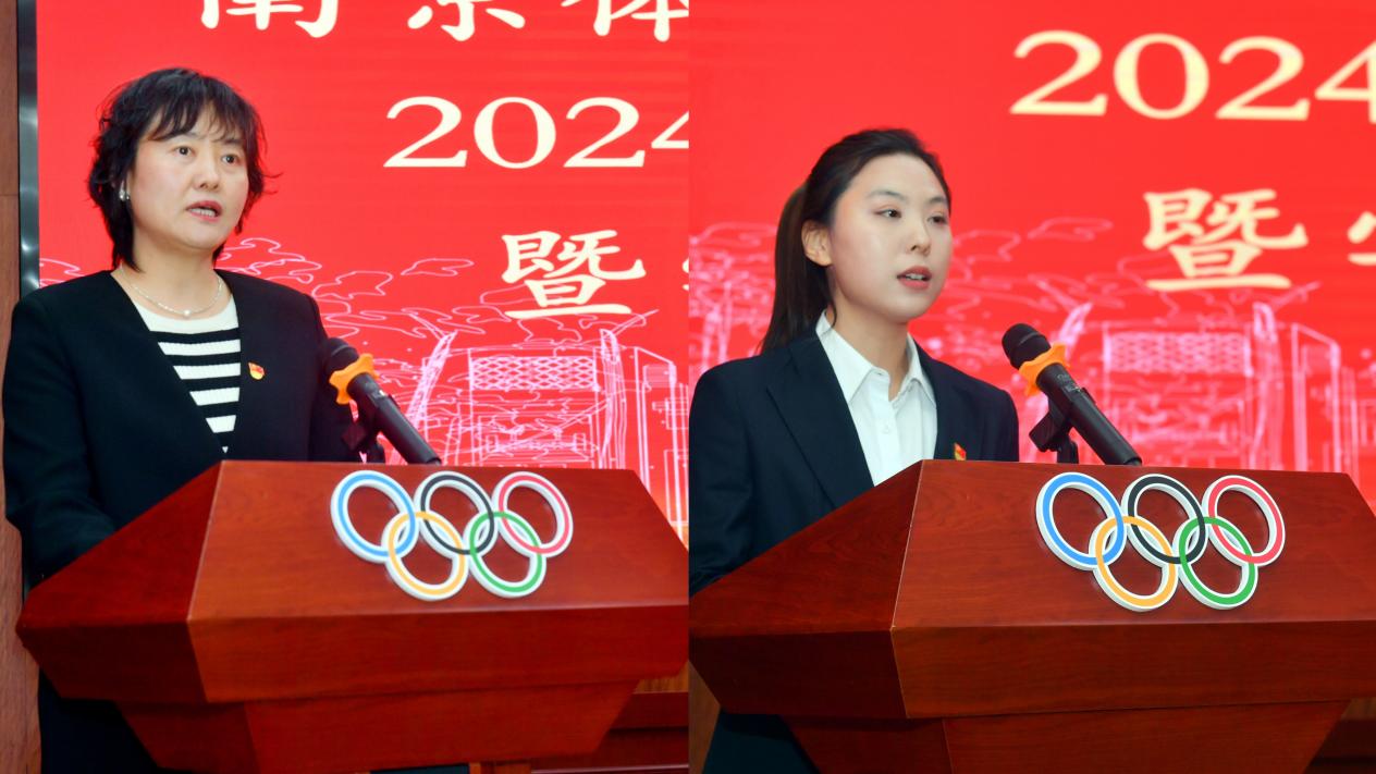 优秀教练员代表范海燕和学生代表刘育彤做交流发言