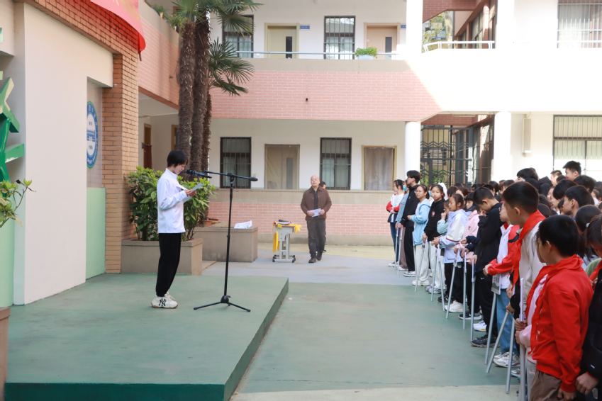 4月7日晨,附属学校在一楼天井隆重举行升旗仪式,全体师生参加。升旗仪式上还进行期中考试动员,及“三好学生”“卫生班级”表彰活动。升旗仪式由附属学校中小学部副主任张波主持。