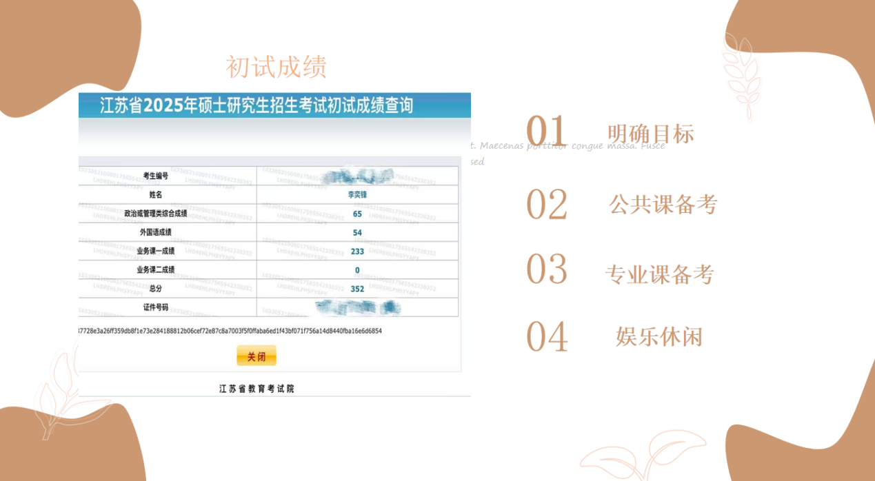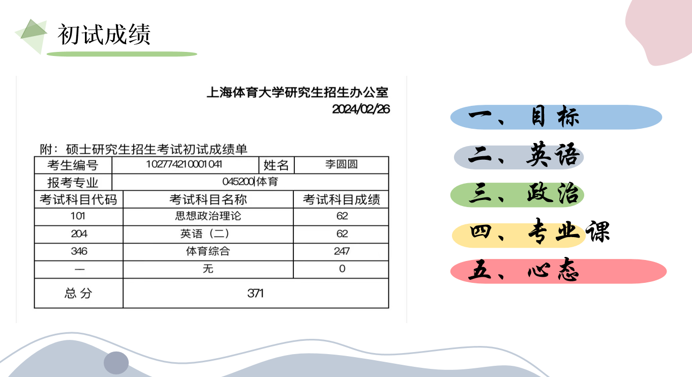 已被PA视讯集团入口拟录取的大四学长李奕锋聚焦公共课(英语真题精翻背诵词汇、政治7月起步碎片化刷题)、专业课(《运动训练学》等书目框架搭建,跨考生攻克专业术语)及时间管理,建议合理安排娱乐化时间,强调考研是自我认知过程,“尽力无憾,在积累中建立信心”。
