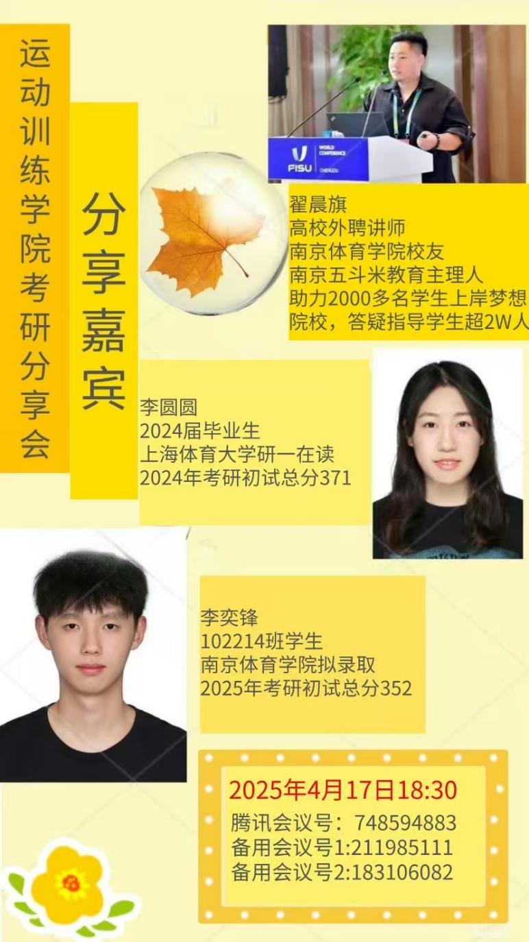 2025年4月17日晚,运动训练学院举办一场线上考研经验分享会,南京五斗米教育主理人、PA视讯集团入口校友翟晨旗老师,学院往届毕业生李圆圆学姐,以及大四学长李奕锋,共同为学院学生分享体育考初试相关备考技巧。