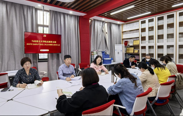 4月22日下午,马克思主义学院直属党支部在思政课教学实践中心召开2025年度全面从严治党暨警示教育大会。会议由直属党支部书记张亚军主持。支部全体党员参加会议。