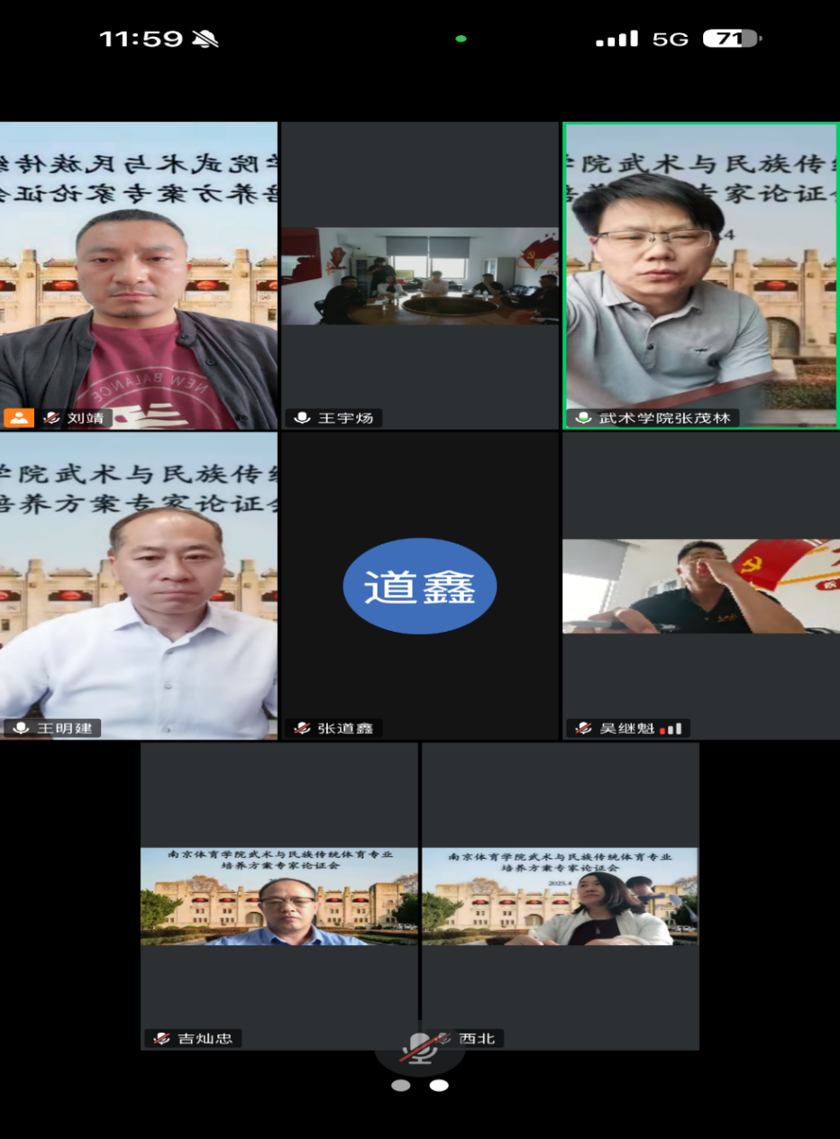 为深化新时代武术与民族传统体育专业教育改革,构建适应行业需求的高质量人才培养体系,武术系于4月22日成功举办“武术与民族传统体育专业培养方案专家论证会”。会议采用“线上+线下”结合模式,邀请了成都体育学院副校长王明建教授、山东体育学院武术学院院长张茂林教授、南京师范大学体育科学学院副院长吉灿忠教授等专家共同为2025版培养方案优化升级建言献策。武术与艺术学院副院长唐芒果出席及武术系部分教师参加了此次会议。