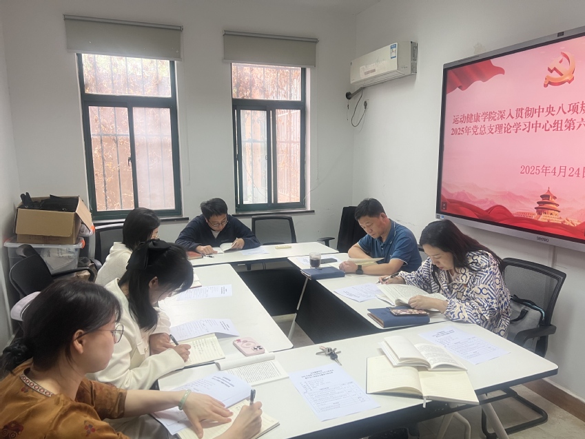 4月24日运动健康学院党总支召开深入贯彻中央八项规定精神学习教育专题读书班暨2025年党总支理论学习中心组第六次集体学习会(扩大)。学习会由学院党总支副书记阚妮妮主持。