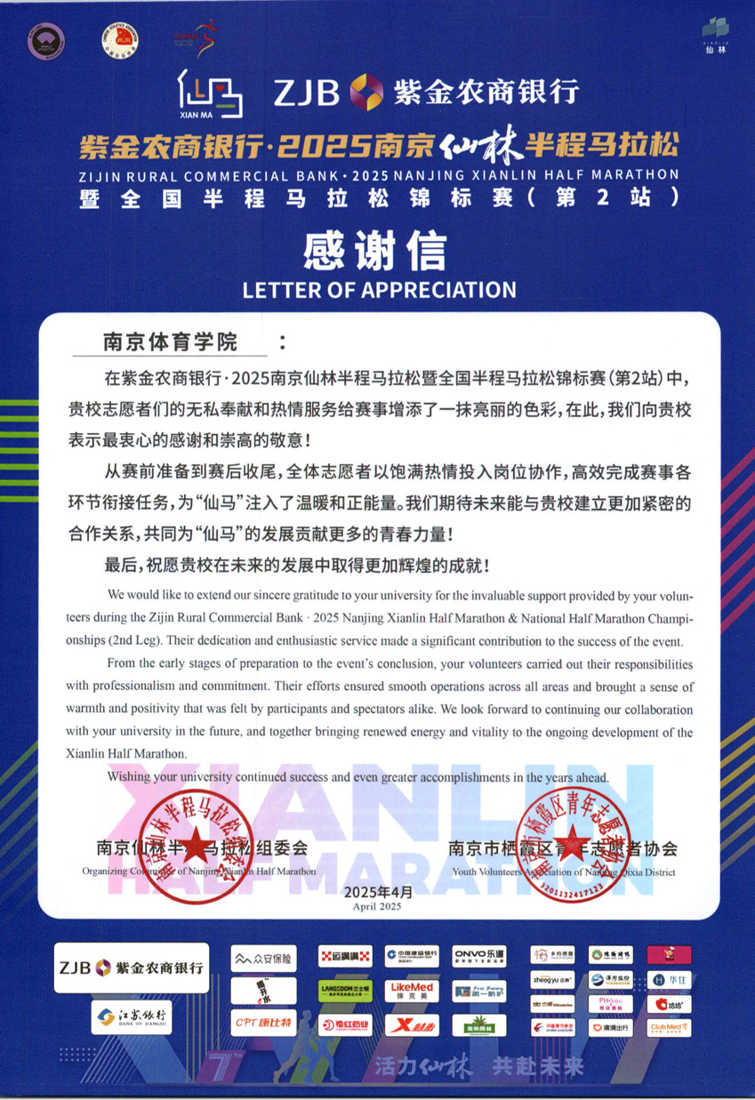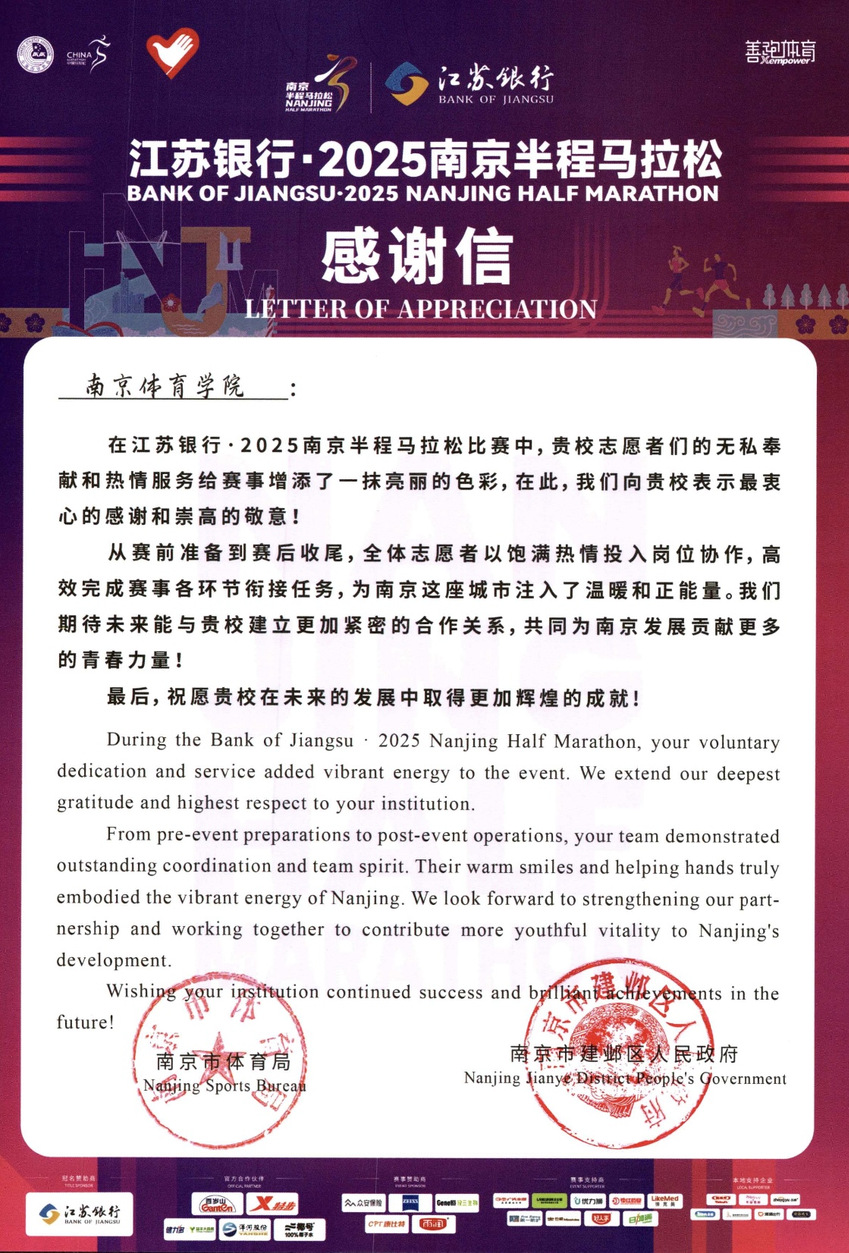 近日,南京半程马拉松、南京仙林半程马拉松组委会向PA视讯发来感谢信,感谢PA视讯集团入口志愿者在2025年对南京半程马拉松、南京仙林半程马拉松比赛工作的支持与助力。