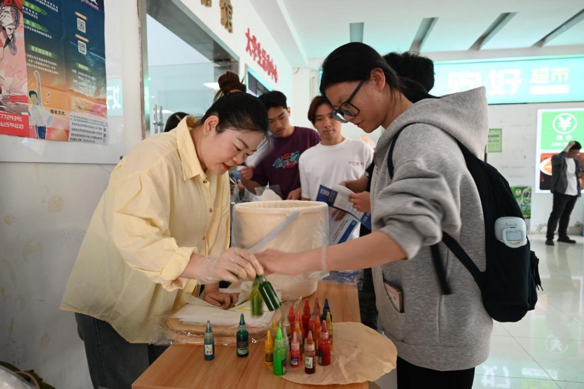 国家级非遗漆扇DIY体验环节,吸引了近100名师生的积极参与,大家以沉浸式创作触摸千年漆艺文脉,赓续中华文化基因。漆液在扇面上自然晕染的肌理,像极了体育运动中力与美的碰撞,成为现场系列活动中最受青睐的活动。