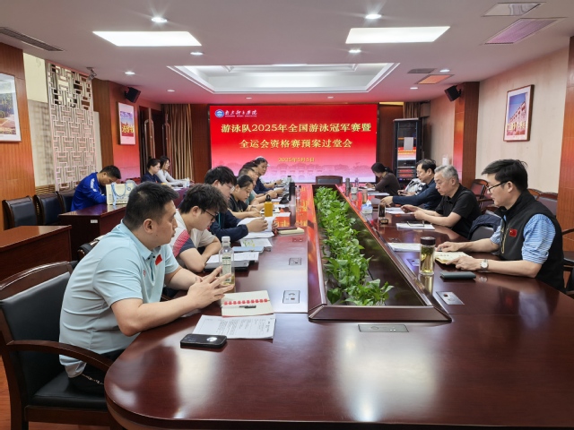 5月5日上午,游泳学院游泳队在行政办公楼301会议室召开2025年全国游泳冠军赛暨全运会资格赛预案过堂会。党委副书记、校长吴兵成,党委常委、副校长刘健出席会议。训练处副处长叶蓁、游泳学院党总支书记骆晓娟、游泳队全体管理干部、一线教练员、体能教练和队医参加会议。会议由游泳学院院长王伟新主持。