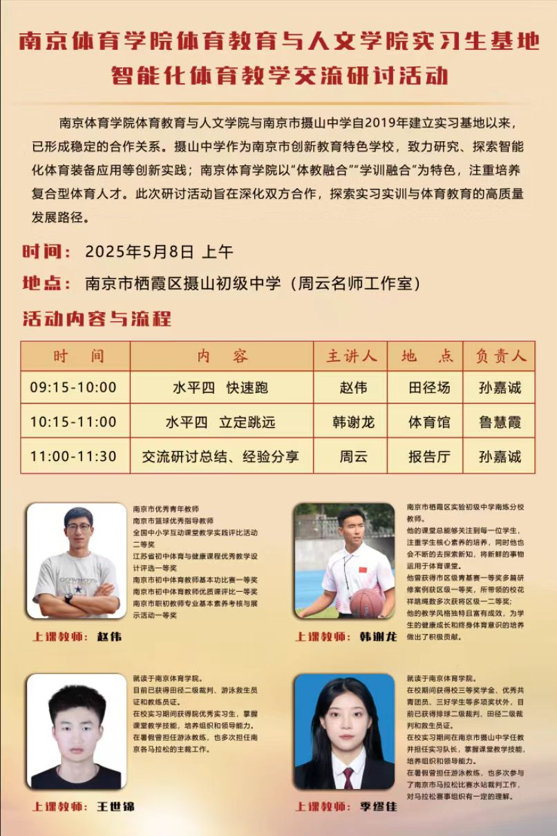 5月8日,PA视讯集团入口体育教育与人文学院在南京市摄山中学开展了一场以智能化体育教学为主题的教研见习活动。体育教育与人文学院院长彭国强,原院长沈鹤军,副院长康晓磊、体育教育系主任霍军、副主任朱乔和老师代表们,以及体育教育专业2022级全体学生到场参与活动。