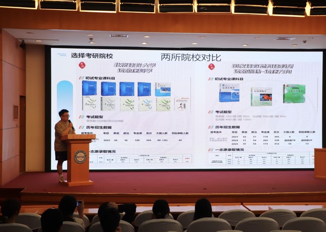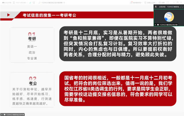 考研上岸的2位毕业生罗宇和王宇航分别从院校专业选择、学习时间规划、学习方法与过程、各自备考经验、参考书目选择、压力调整等角度做了详细的交流与分享。他们的分享准备充分,内容丰富,干货满满。