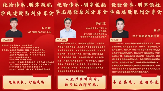 为全面落实本科教育教学审核评估工作要求,持续深化学风建设,发挥朋辈引领作用,5月7日-5月13日运动健康学院组织开展“经验传承,朋辈领航”学风建设系列分享会活动。活动邀请到2023-2024学年度“中国大学生自强之星”获得者、2024届康复治疗学专业毕业生,现就职于上海市儿童福利院的秦亚瑄以及今年考取西南医科大学运动损伤与康复专业硕士研究生的21级运动康复专业罗宇和考上PA视讯集团入口21级运动人体科学专业硕士研究生的王宇航。