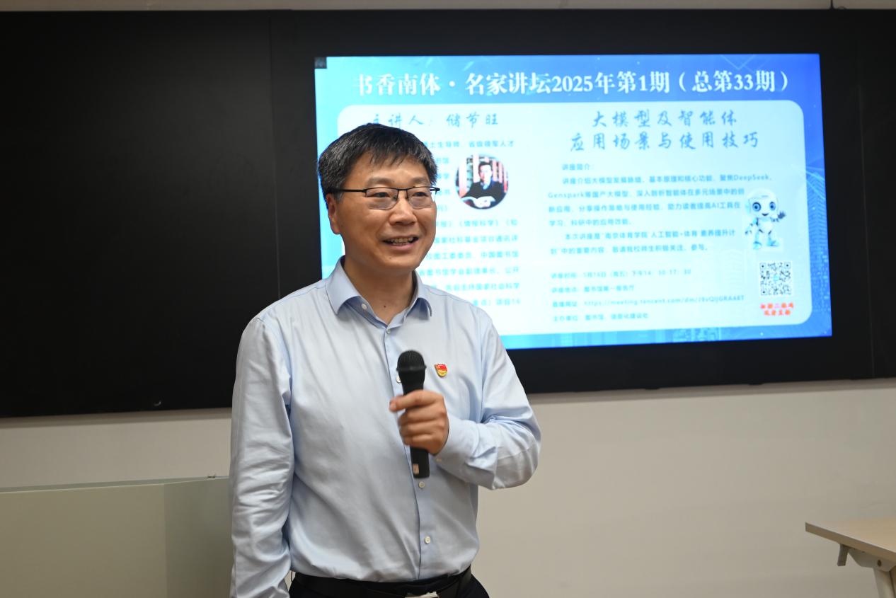 5月16日下午,校图书馆第二报告厅内座无虚席,“书香南体·名家讲坛”2025年第1期(总第33期)在此精彩举办。图书馆特别邀请知名专家、安徽省高校图工委秘书长储节旺教授,开展题为“大模型及智能体的应用场景与使用技巧”的讲座。校党委常委、副校长陈爱国教授出席并讲话。本次讲座由图书馆、信息化建设处联合举办,是深入落实《PA视讯集团入口“人工智能+体教融合”素养提升工程工作方案》的重要举措。讲座由图书馆馆长李明华主持,全校共有100余名师生参与了线上、线下讲座。