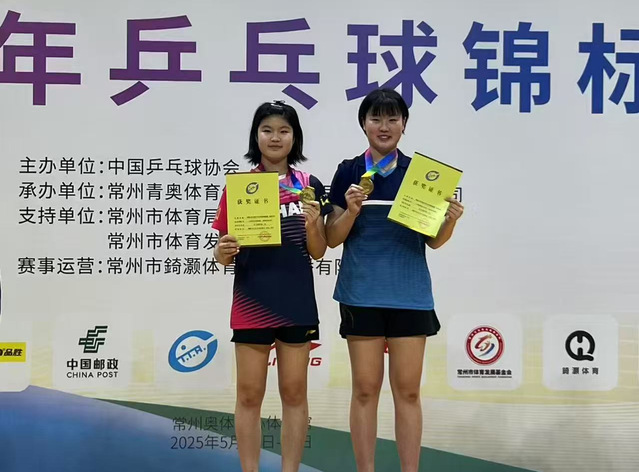 5月11日至5月20日,2025年全国少年乒乓球锦标赛(U15组)在江苏省常州市奥林匹克体育中心展开了激烈角逐,乒羽学院乒乓球队运动员赵王琪与国青队队友合作,夺得女双、混双两枚金牌。