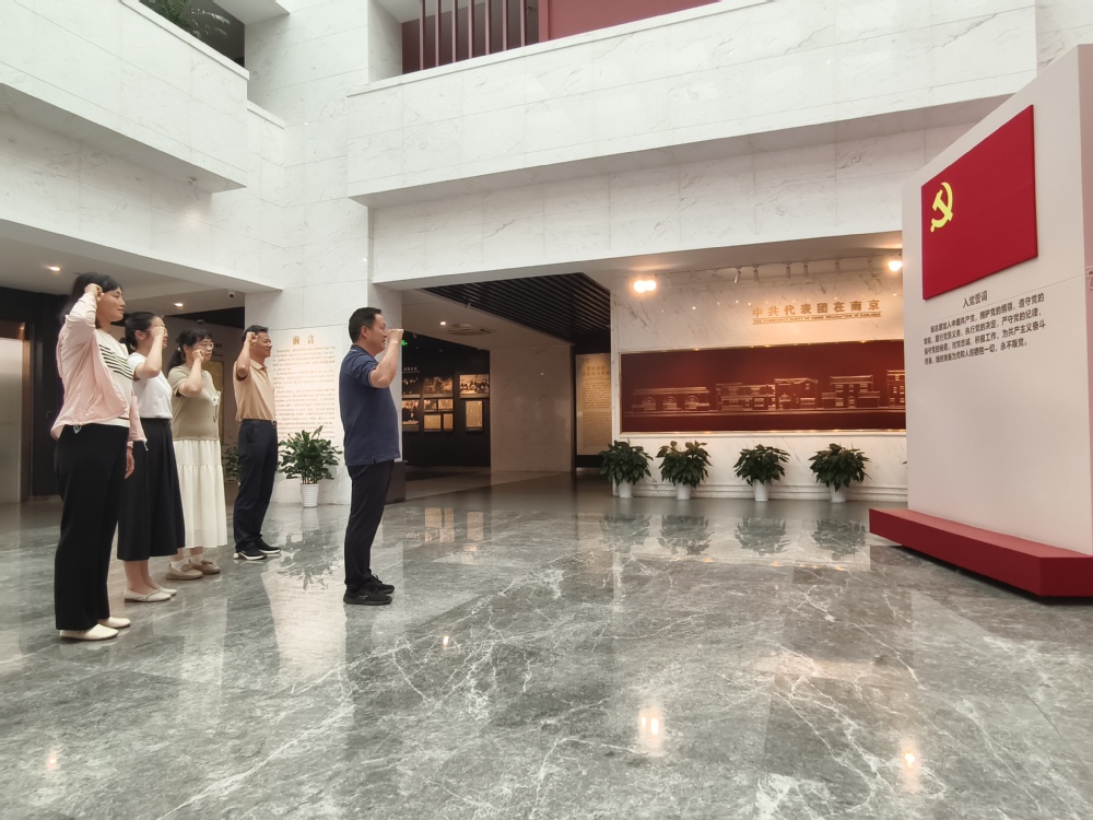 步入展厅,汉白玉浮雕庄严肃穆,党员们在党支部书记李龙的带领下重温入党誓词。活动中,党员们瞻仰革命先烈,参观了中共代表团办事处旧址、国共南京谈判史料陈列馆、周恩来与抗日民族统一战线史料展等场馆及展览,重温1946—1947年国共谈判期间中共代表团在险恶环境中坚守信仰、斗争到底的光辉历程,深刻体悟以周恩来为首的中共代表团克己奉公、廉洁自律的政治品格,家国天下、勤廉为本的优良家风,从革命先辈的躬身垂范中汲取精神力量。随后,全体党员徒步至国民大会堂旧址,在徒步中细细感受南京的历史文化底蕴。