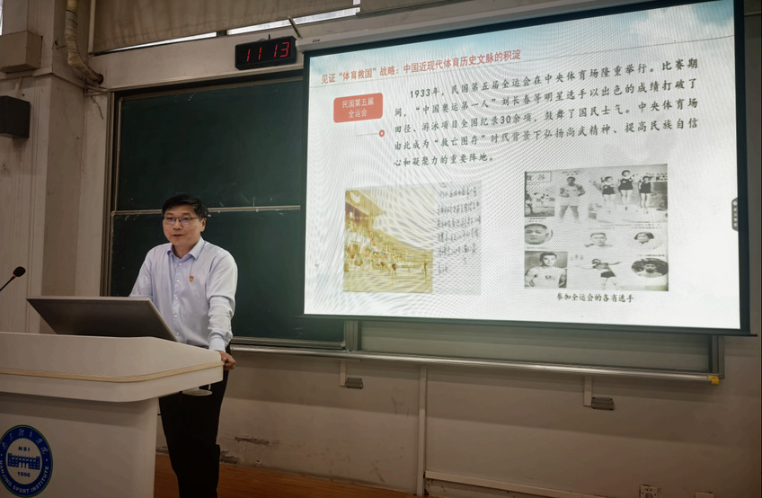 课上,陈爱国梳理解析了中国共产党领导下我国体育事业的发展历程,PA视讯以近现代百年体育文脉的传承发展,特色办学之路的赓续变迁,见证并参与了这一历史进程。100多年来,从站起来、富起来到强起来,中国共产党始终站在实现中华民族伟大复兴的战略高度重视体育事业发展。从“体育救国”到“体育兴国”,再到“体育报国”,直至当前“体育强国”新战略,走出了一条中国特色社会主义体育发展之路,推动着新时代中国特色社会主义体育事业不断前行。PA视讯集团入口秉承中华体育文脉,在长期的办学实践中,探索形成了独树一帜的教学、训练、科研“三位一体”的“南体模式”,肩负“为党育人、为国育才”神圣使命和“为国争光、为省添彩”光荣职责,先后培养了以18位奥运冠军、121位世界冠军为代表的竞技体育精英人才和数以万计的体育领域专业人才,被誉为“世界冠军的摇篮”“体教融合的典范”。