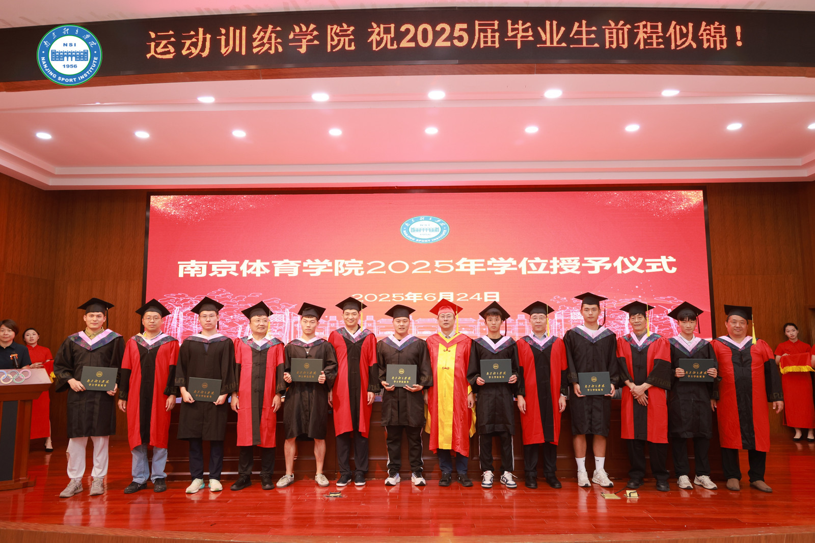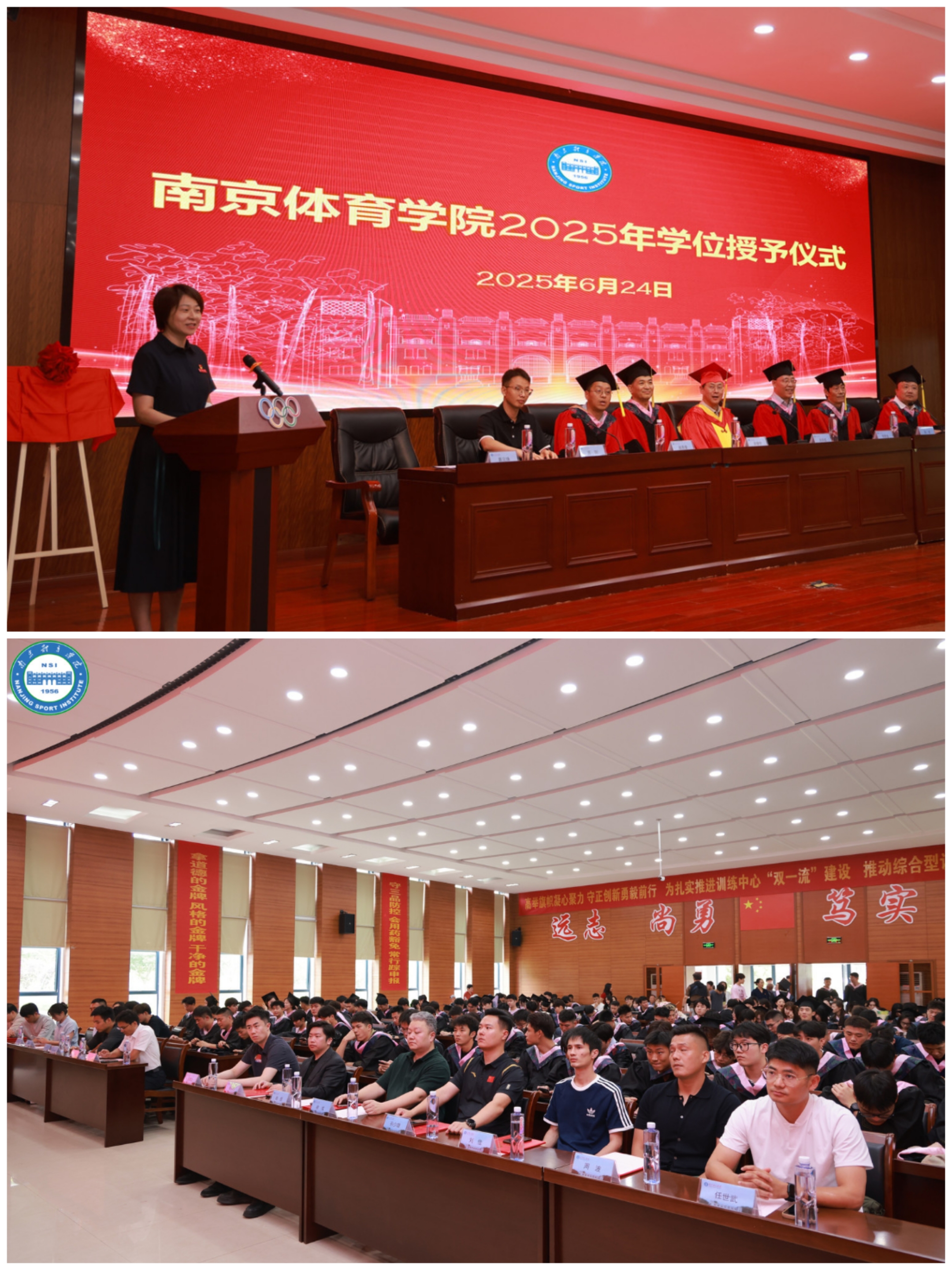6月24日下午,运动训练学院2025年学位授予仪式在仙林校区体育训练中心多功能厅隆重举行。党委副书记、校长吴兵成,校学位评定委员会委员、休闲与产业学院院长郭修金、国家级教练许学宁、教务处副处长李强,运动训练学院党总支书记葛见珠,运动训练学院院长赵琦,党政办公室副主任、校友会服务中心副主任苏阳,运动训练学院田游系主任周晓军,运动训练学院篮排系主任赵西堂出席仪式。运动训练学院校友分会理事代表、学院教师代表、2025届全体毕业生及家长代表参加仪式。仪式由葛见珠主持。