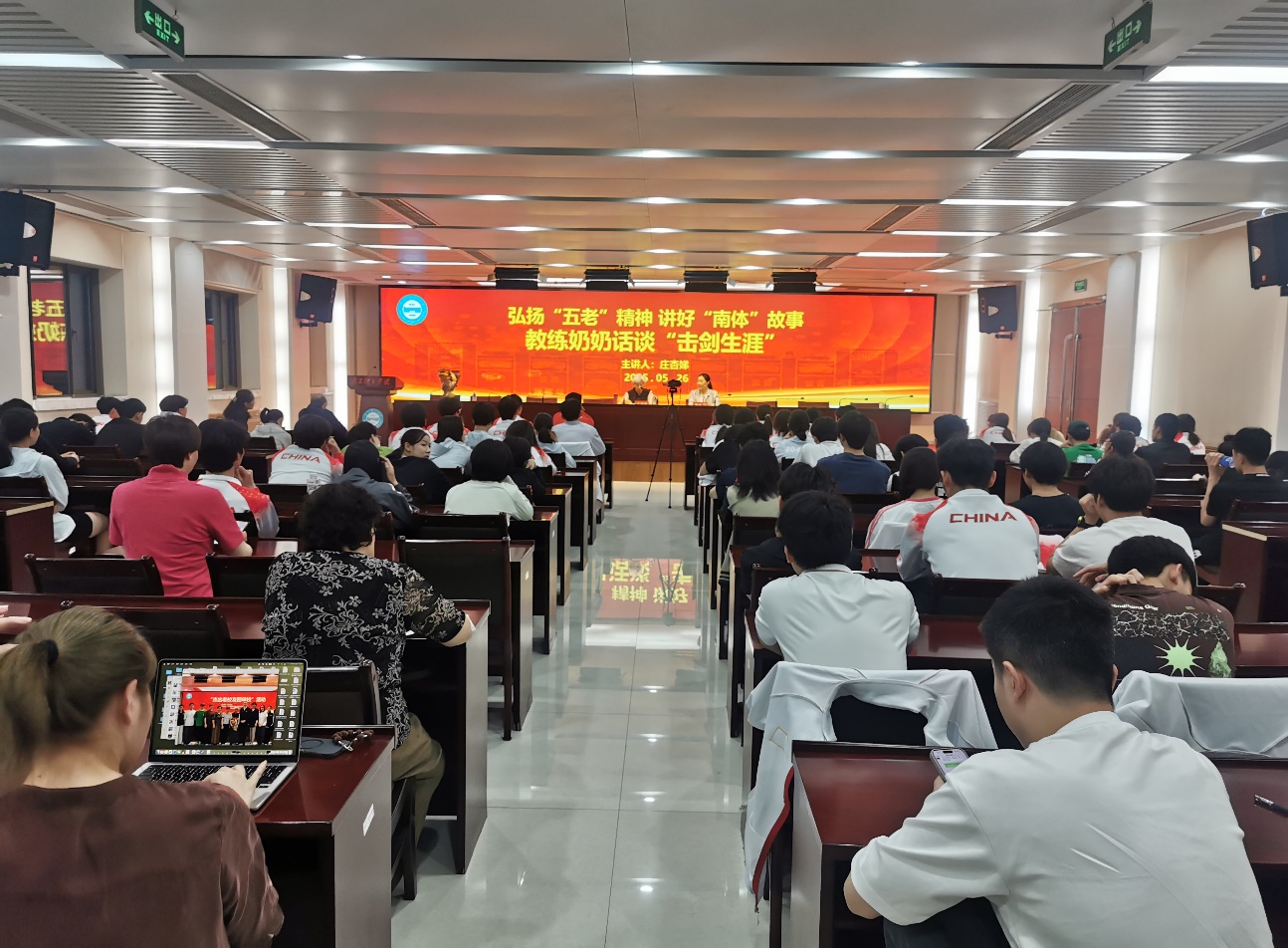 84岁的退休教练庄杏娣以“我的击剑生涯”为主题,向师生讲述了她在运动员、教练员岗位上的奋斗历程,并与青年运动员、大学生展开深入交流。