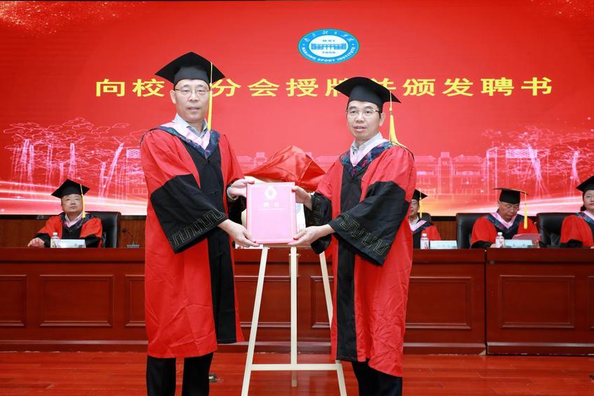 校党委副书记兰亚明向体育产业与休闲学院院长、校友分会会长郭修金颁发聘书