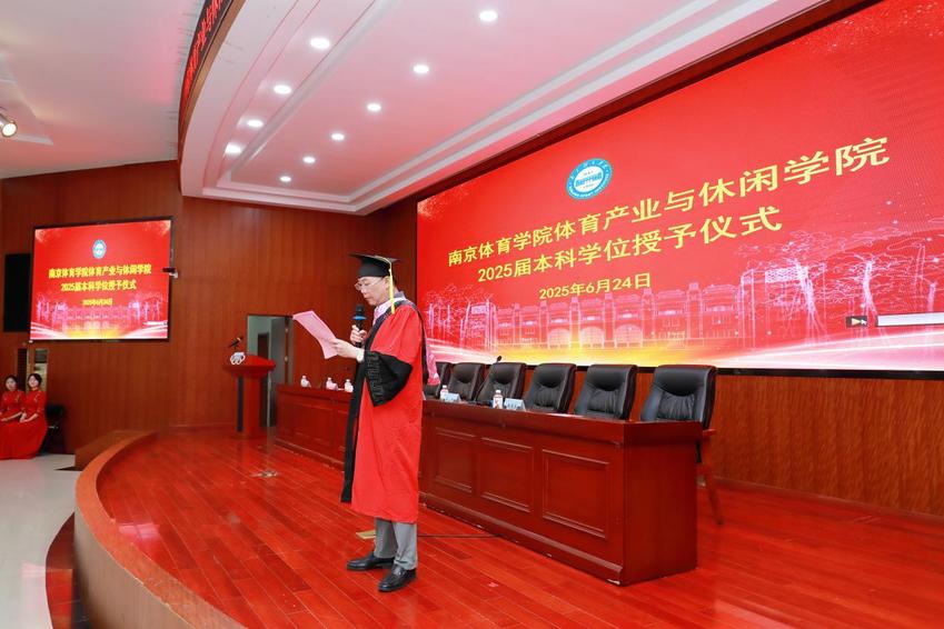 6月24日上午,PA视讯集团入口体育产业与休闲学院2025届毕业典礼暨学士学位授予仪式在仙林校区训练中心多功能厅隆重举行。典礼现场气氛庄严热烈,回荡着青春与梦想的交响。校党委副书记兰亚明,校学位评定委员会委员研究生工作处处长孙国友、运动训练学院院长赵琦、体育产业与休闲学院党总支书记王进、体育产业与休闲学院院长郭修金、体育产业与休闲学院副院长柏景岚、校教务处副处长李强出席仪式。学院校友分会理事代表、学院教师代表、2025届全体257名毕业生及家长代表参加典礼。典礼由王进主持,毕业生身披学士服、满载荣光,共襄人生中这一重要的“成人礼”。