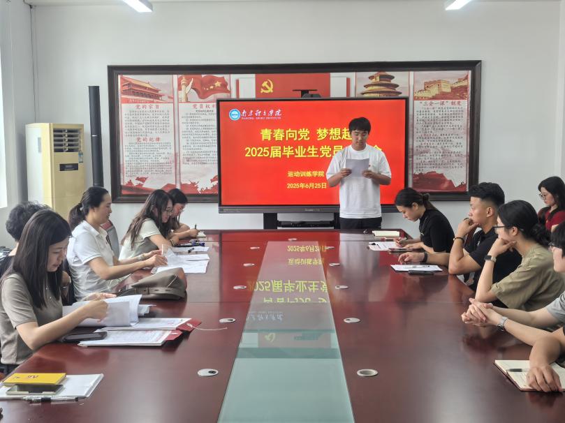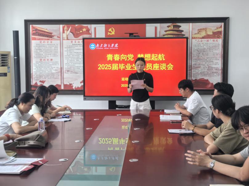 为切实做好毕业生党员思想政治教育工作,进一步加强毕业生理想信念教育,引导广大毕业生党员在新的人生征途上坚守初心、勇担使命,运动训练学院于2025年6月25日下午在仙林校区教学楼B305开展“青春向党 梦想起航”毕业生党员座谈会。参加此次会议的有学院党总支副书记沈灵知、组织联络员孙玉香,学院辅导员以及全体毕业生党员,会议由辅导员龙文蓉主持。