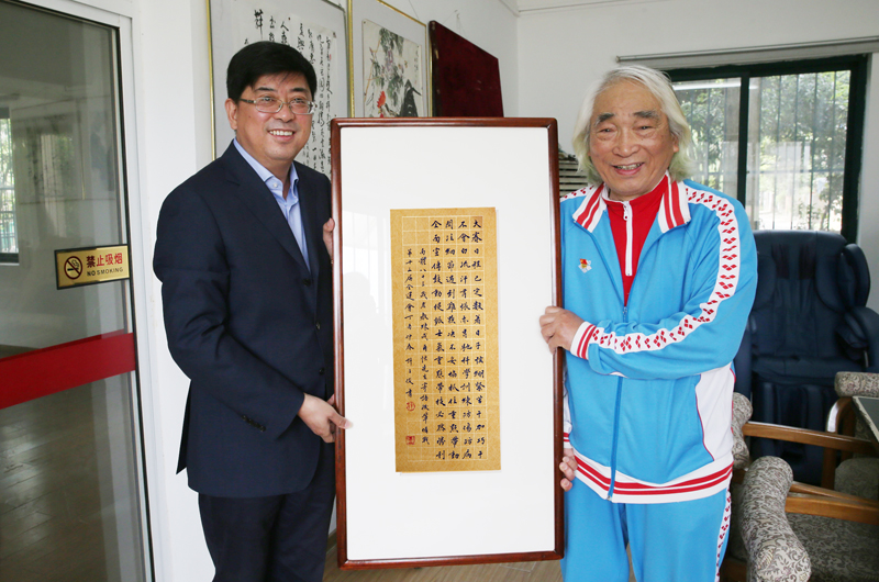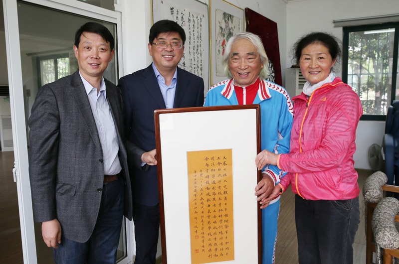 4月21日,杨国庆院长到离退休老同志活动室看望成尔恒教练等老同志,并向成老赠送了条幅,以此感谢广大离退休老同志对学院工作的关心支持。离退休工作办公室主任尤维娜,院党委宣传部部长、统战部部长许立俊等陪同。