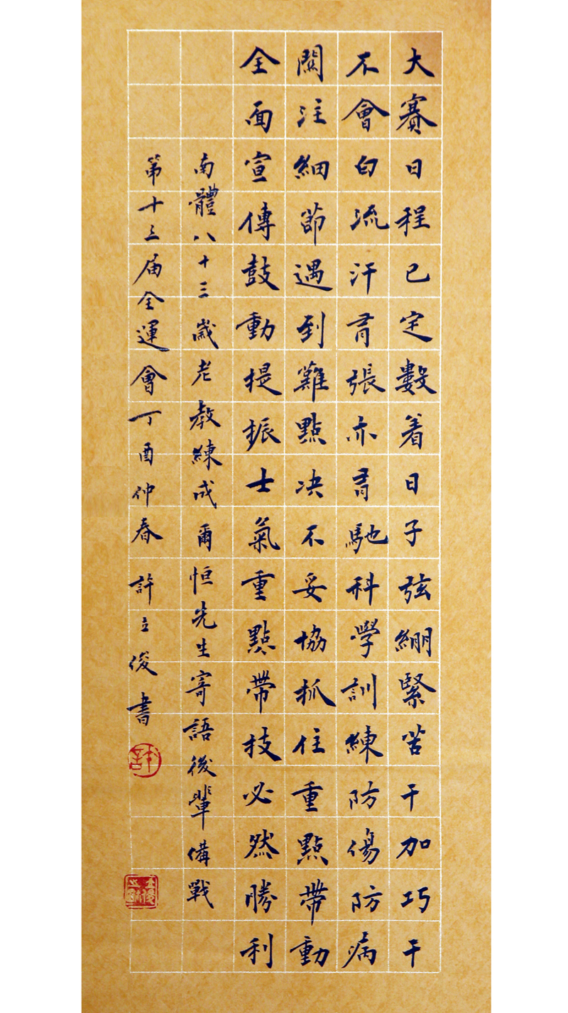 条幅文字为成老写给我院备战第13届全运会运动队的寄语,全文如下:大赛日程已定,数着日子绷弦紧!苦干加巧干,不会白流汗!有张有弛,科学训练,防伤防病,关注细节!遇到难点,决不妥协,抓住重点,带动全面!宣传鼓动,提振士气!重志带技,必然胜利!!!