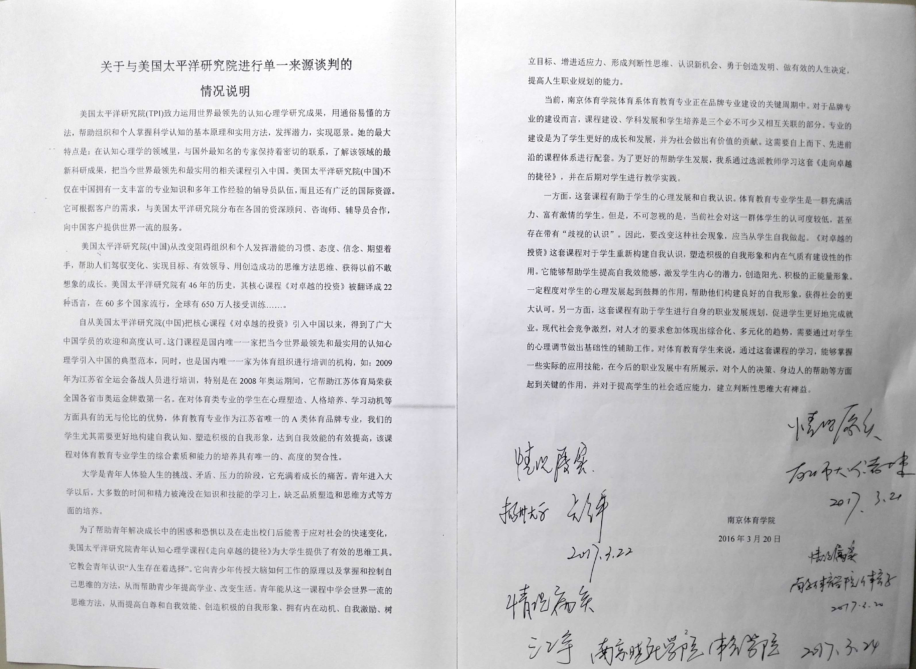 经专家评估论证(专家论证意见详见附件),美国太平洋研究院有46年的历史,其核心课程《对卓越的投资》被翻译成22种语言,在60多个国家流行,在全球有650万人接受训练。自美国太平洋研究院(中国)把核心课程《对卓越的投资》引入中国以来,得到了广大中国学员的欢迎和高度认可,是国内唯一一家把当今世界最领先和最实用的认知心理学引入中国的典型范本,同时,也是国内唯一一家为体育组织进行培训的机构。《对卓越的投资》这套课程对于学生重新构建自我认识,塑造积极的自我形象和内在气质有建设性的作用,与体育教育专业学生的综合素质和能力的培养具有唯一的、高度的契合性。