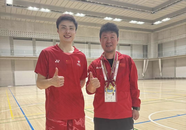 石宇奇(左)与教练员孙俊