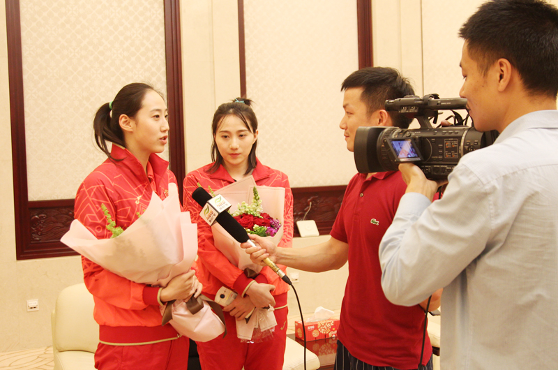 世界冠军顾笑(左一)、梁馨枰(左二)接受媒体采访
