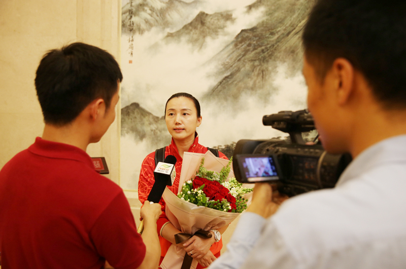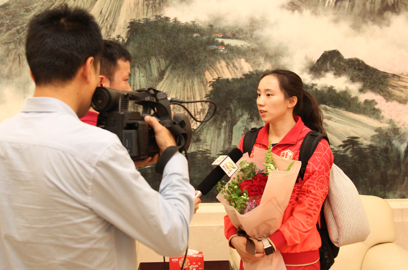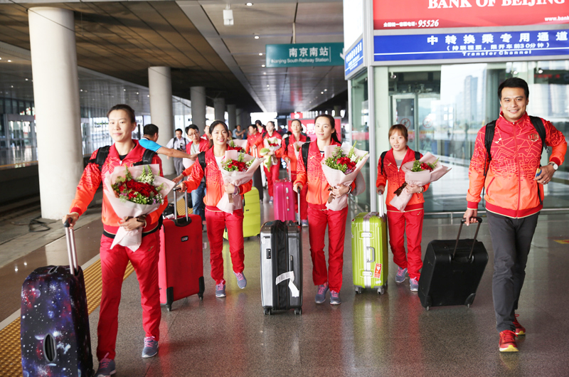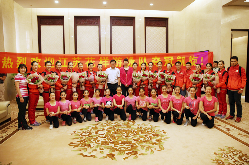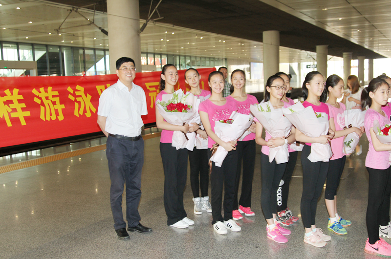 党办院办、党委宣传部、训练处、游泳系有关人员和花游队小运动员及教练到南京南站迎接了花游队。在车站休息室,花游队主教练王芳,世界冠军、花游队队长呙俐,世界冠军顾笑、梁馨枰接受了媒体采访。