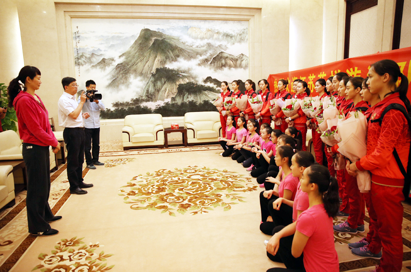 杨国庆院长到南京南站迎接并发表讲话。他说,首先是祝贺,祝贺你们夺得十三届全运会我省代表团的第一枚金牌,为全院乃至江苏代表团征战全运会鼓舞了士气。第二是感谢,感谢大家努力拚搏,精诚团结,在时隔12年之后再次获得花游集体项目的金牌,这胜利来之不易,是运动员、教练员和广大管理干部长期共同努力的结果。第三是希望,希望你们要保持优势,把优良而光荣的传统传给小队员,小队员要以出征天津的大队员为榜样,刻苦训练,努力成长,积极投身到江苏花游事业的建设发展中去。肖爱华副院长和花游队同车抵宁。