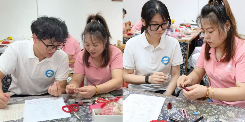 下午,实践团队走进马庄村香包文化大院进行实地调研,工作人员介绍大院形成的“原料采购—技艺培训—产品制作—线上线下销售—绣娘直播”香包产业链闭环,年产值突破800万元,带动400余名村民就近就业,实现“小香包”撬动“大产业”的振兴模式。随后,团队成员现场体验了“捧捧场”香包的制作技艺,经过香料调配、布料裁剪、图案刺绣等核心工序,切身感受传统工艺的精湛。