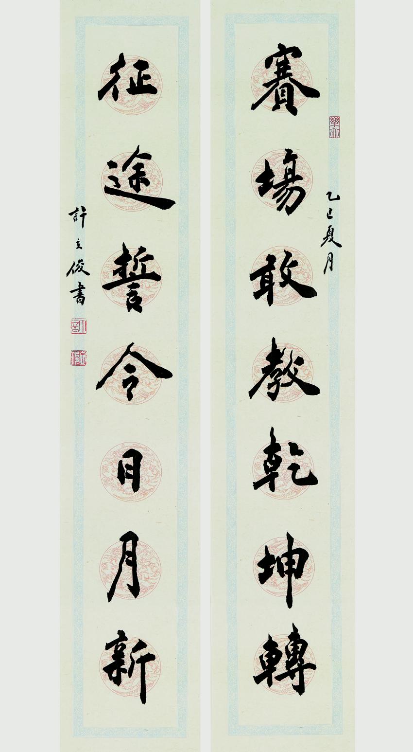 楷书 赛场敢教乾坤转 征途誓令日月新 70cm-14cmx2