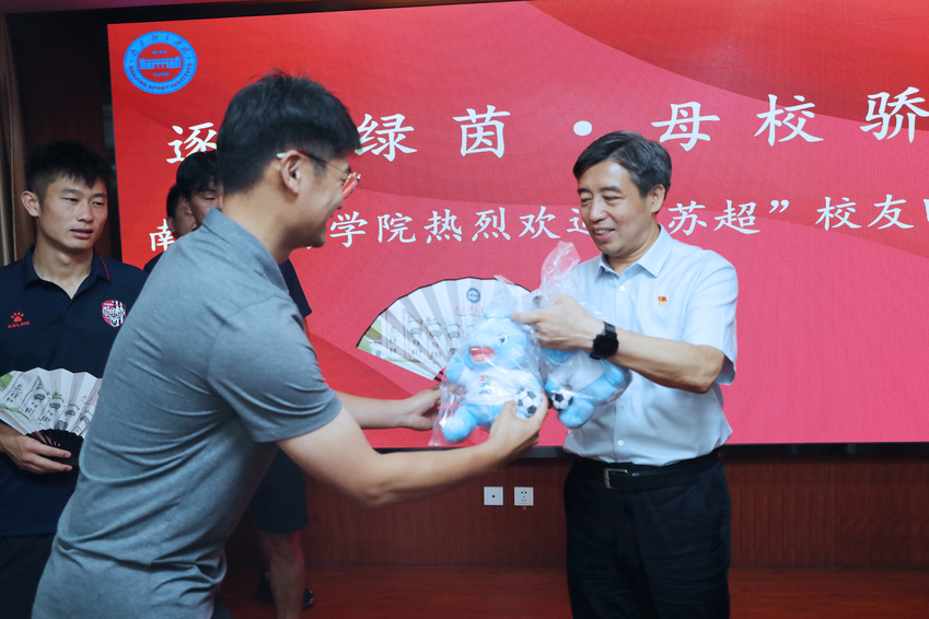 会上,双方互赠了纪念品。刘红明向7位校友代表赠送了写有南体校训“严和朴实”的折扇。校友代表们向刘红明、兰亚明赠送了“苏超”吉祥物布偶。
