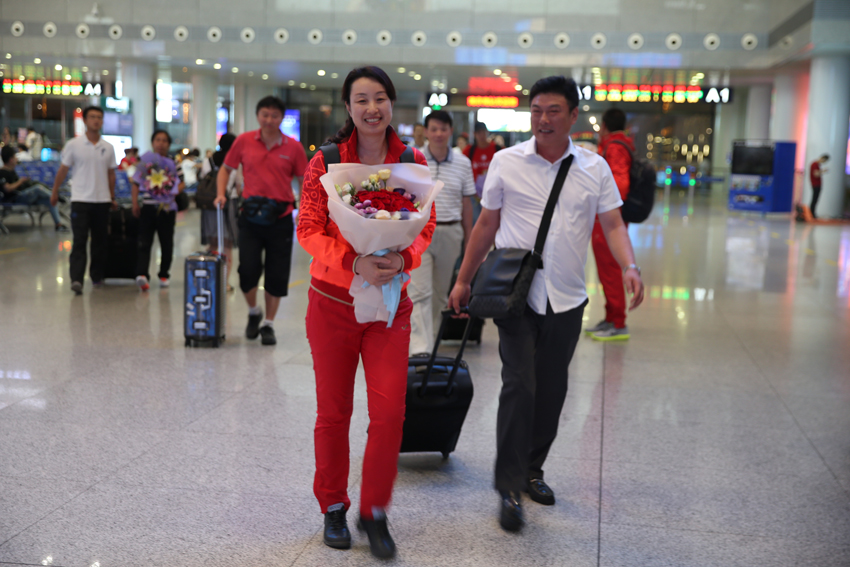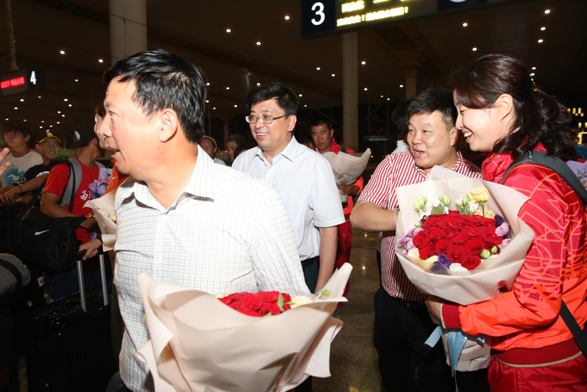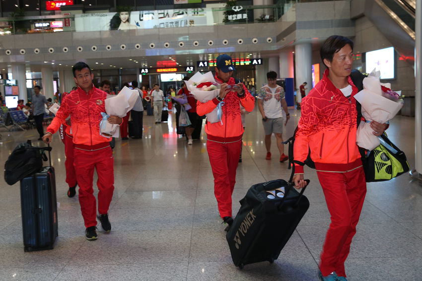 网球队夺冠凯旋,教练员、运动员走出车站