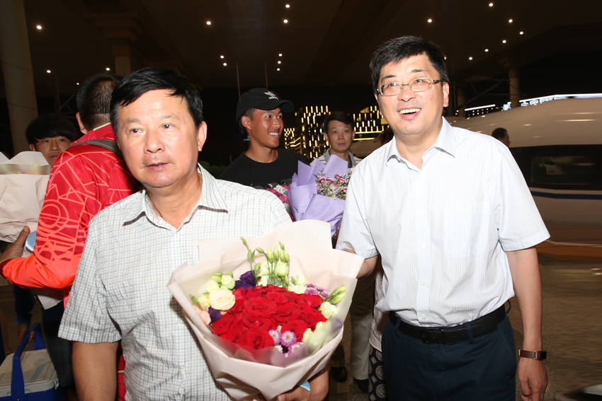 网球队夺冠凯旋,杨国庆院长到车站迎接,蒋宏伟副院长手持鲜花走出车站
