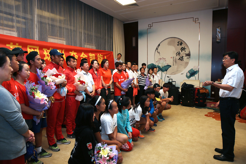 一是祝贺网球队夺得本届全运会网球男团冠军。网球队在十分困难的环境和异常激烈的竞争中拿下男团冠军,实现全运会四连冠,连续16年保持中国网球男团最高水平,这个成绩来之非常不易,是一个新的历史辉煌。