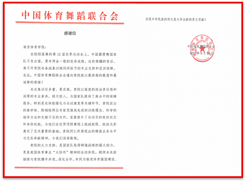 中国体育舞蹈联合会向南体发来感谢信